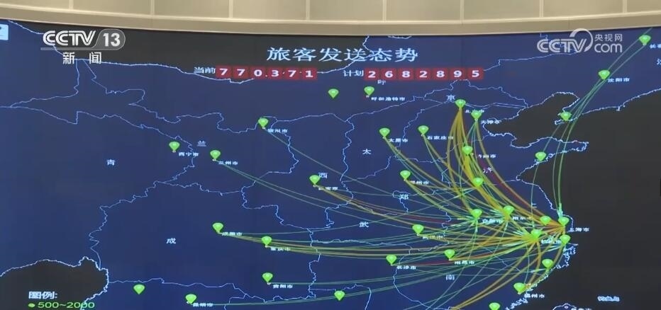 總臺央視記者 鄭連凱:在調(diào)度大廳的屏幕上,我們可以實(shí)時(shí)看到包括剛剛采訪的虹橋站在內(nèi),整個(gè)長三角地區(qū)740多座車站的客流情況,以及13000多公里鐵路線上列車的運(yùn)行狀態(tài)。而這張圖顯示的是從長三角連通全國各地的干線鐵路的繁忙程度,其中紅色的京滬、滬漢榮、滬昆代表著最繁忙,這里的工作人員可以根據(jù)客票需求隨時(shí)調(diào)度,增開臨客列車。