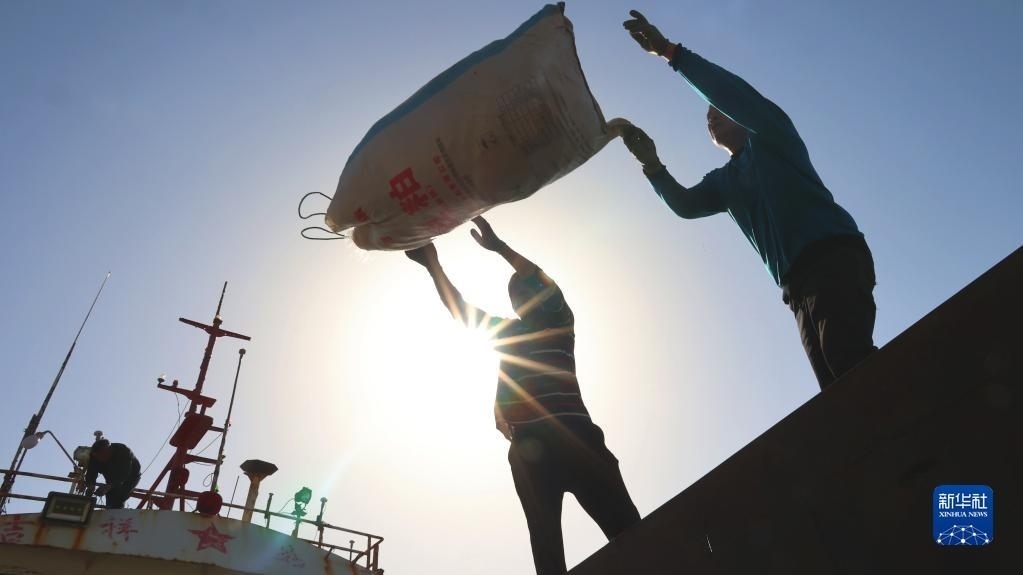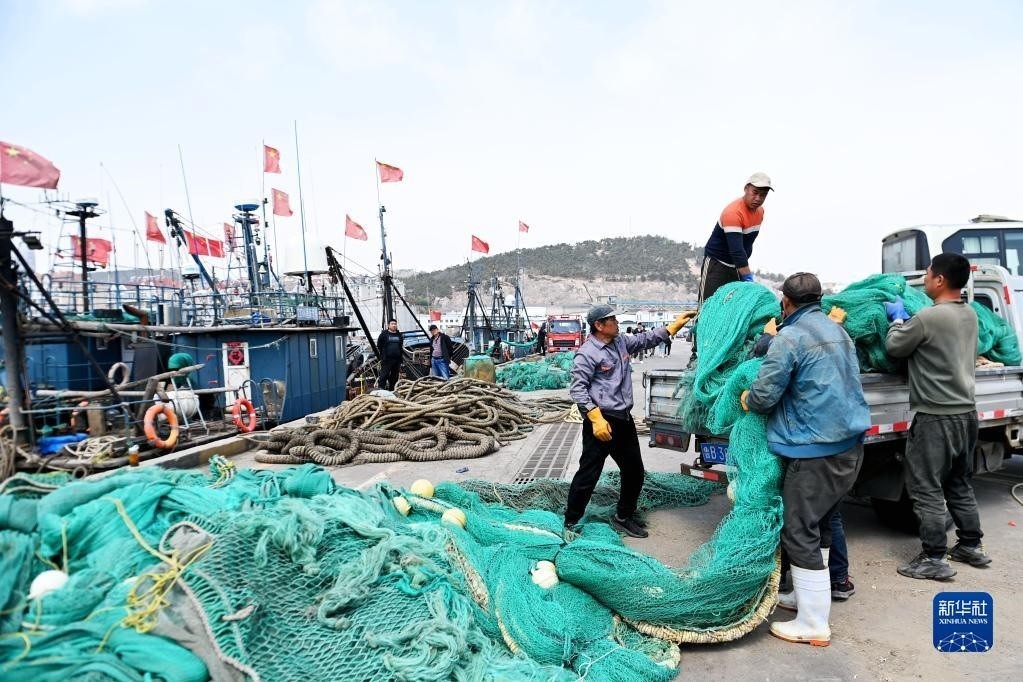 4月30日,在山東青島西海岸新區(qū)積米崖漁港,漁民在卸載漁船上的網(wǎng)具。