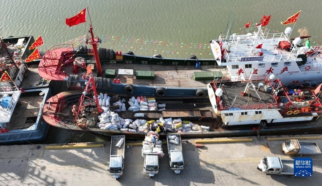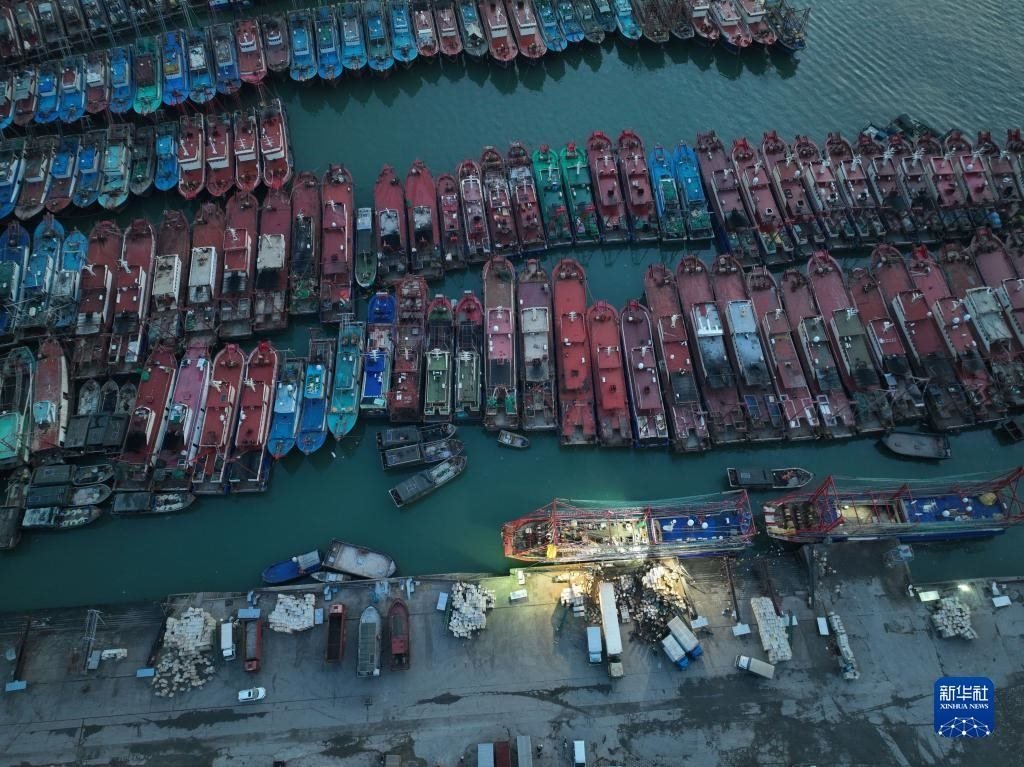 4月30日,在江蘇省連云港市贛榆區(qū)青口漁港碼頭,漁民在卸載漁具,為即將到來的伏季休漁做準(zhǔn)備(無人機(jī)照片)。