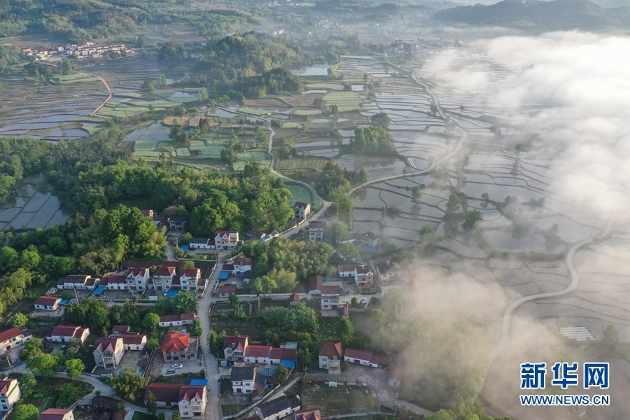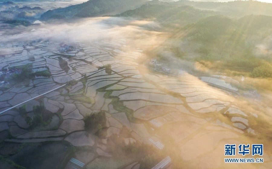 春日清晨,航拍安徽省宣城市旌德縣興隆鎮(zhèn)三山村,線條優(yōu)美的梯田、若隱若現(xiàn)的村莊、濃淡相宜的云霧、變幻莫測(cè)的朝霞,描繪出一幅幅美麗的鄉(xiāng)村畫卷。