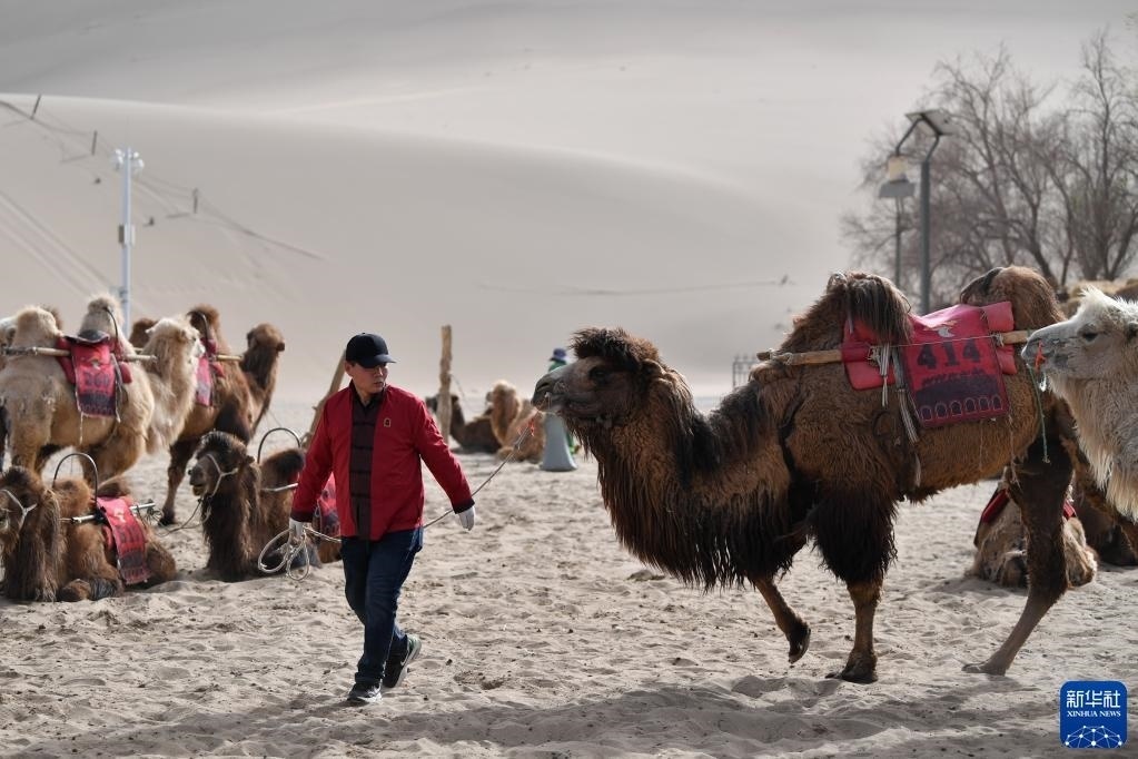 曹文華牽著駱駝在鳴沙山月牙泉景區(qū)駱駝騎乘點(diǎn)等待游客(4月24日攝)。
