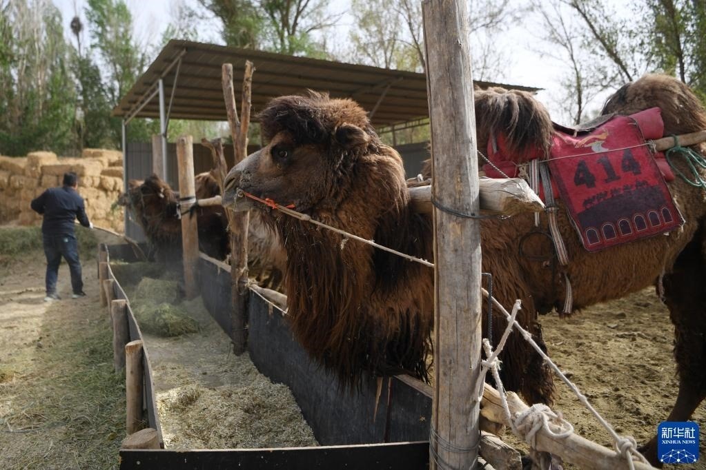 編號(hào)“414”的駱駝“上班”前在駝圈里吃草料(4月24日攝)。