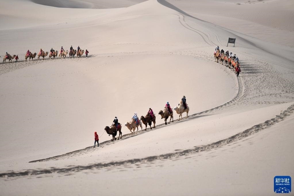 載著游客的駝隊(duì)行走在鳴沙山月牙泉景區(qū)(4月24日攝)。