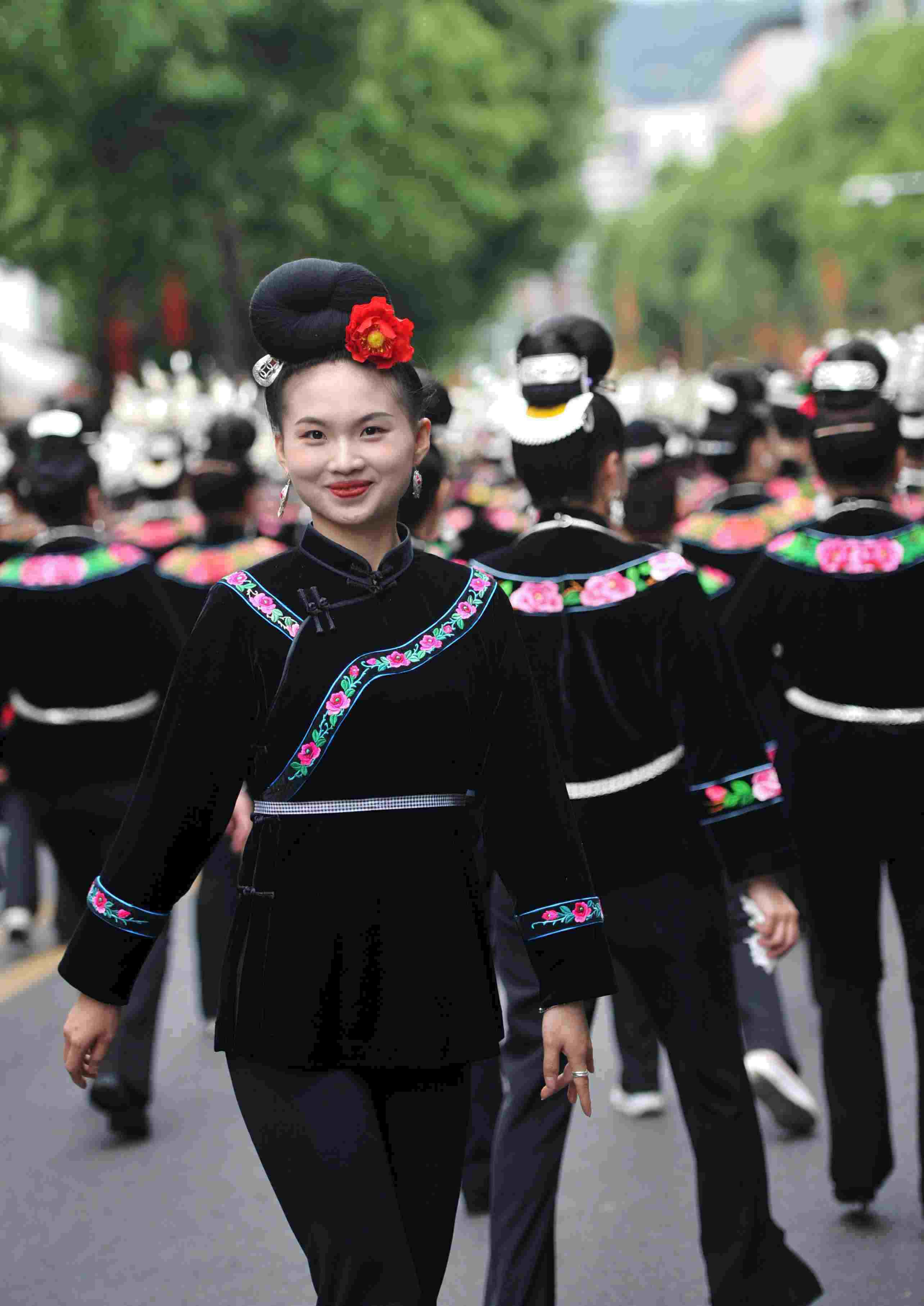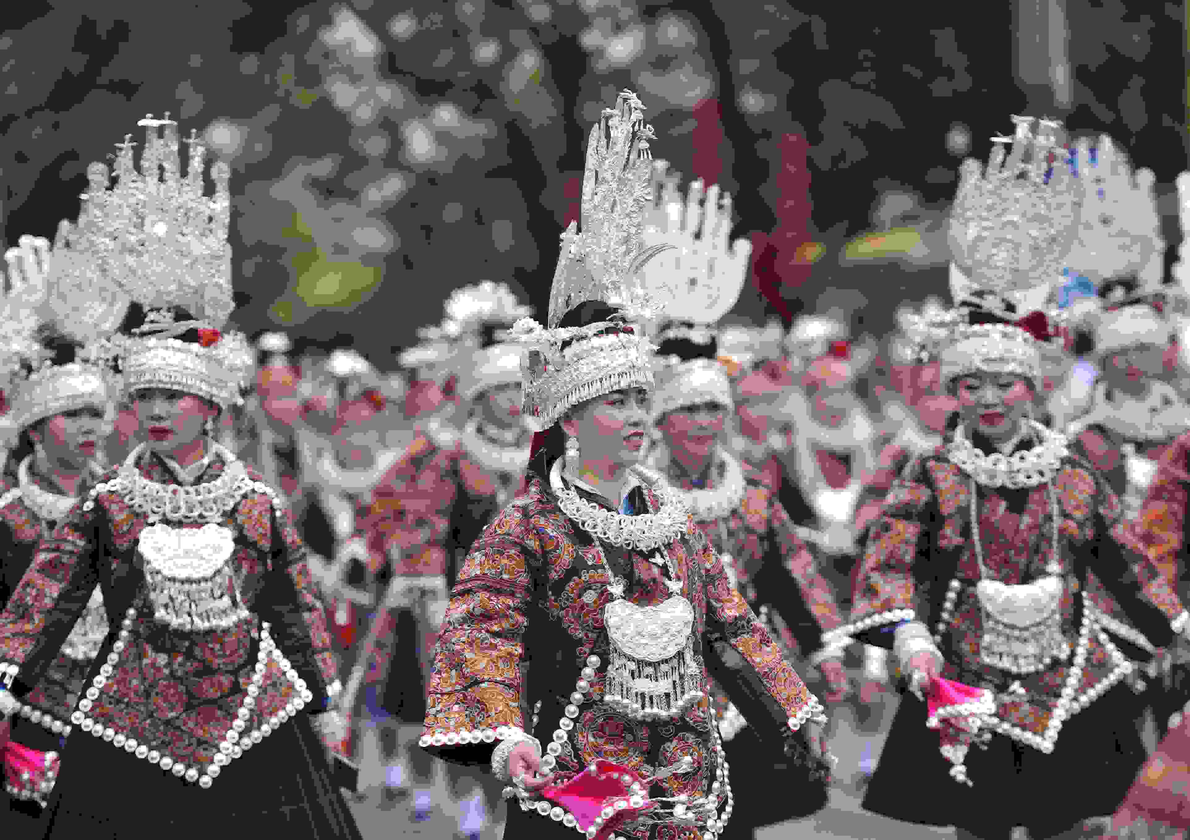 2023年5月2日,貴州省臺江縣,苗族女子盛裝參加“姊妹節(jié)”游演。