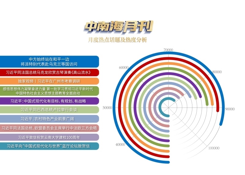 央視網(wǎng)“智聞”系統(tǒng)提取分析4月全網(wǎng)時政新聞熱點顯示,“中方始終站在和平一邊,將派特別代表赴烏克蘭等國訪問”“中法元首非正式會晤”“習近平在廣州市考察調(diào)研”等話題備受關(guān)注。
