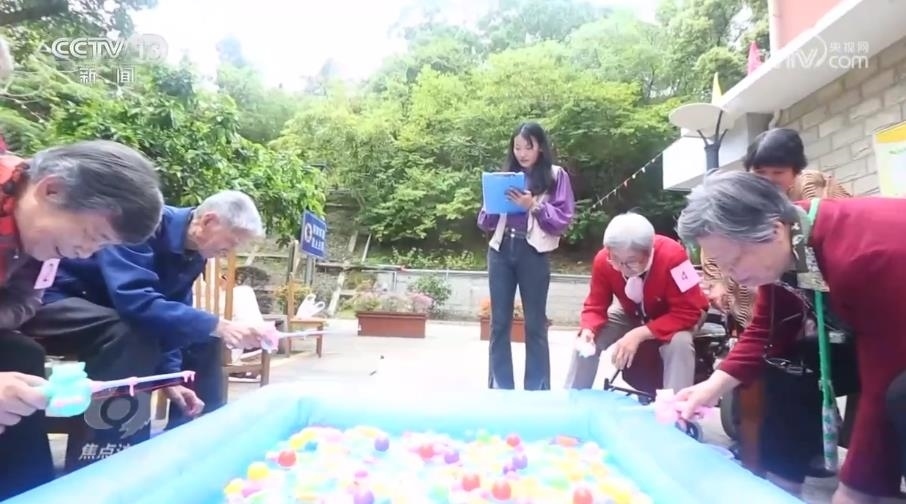 充氣魚池、塑料魚、網(wǎng)兜、小桶,在福利院的大院里,一場趣味釣魚大賽正在緊張進行。這個披肩長發(fā)、特別愛笑的裁判是老人們的“開心果”,也是福利院的“90后”社工朱小冉。和護理員楊愛紅不同,朱小冉的主要工作通俗來說,就是怎么讓老人們過得更樂呵。
