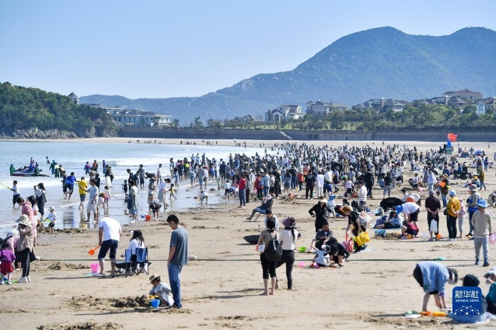 4月30日,游客在浙江舟山朱家尖景區(qū)沙灘上嬉戲游玩。