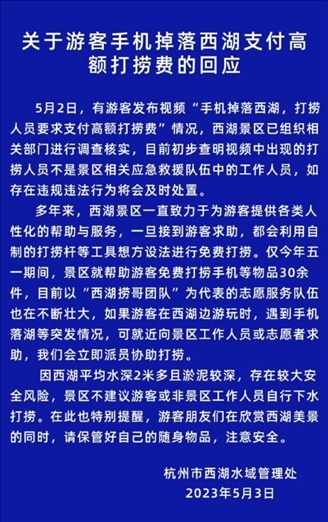 ·西湖景區(qū)回應(yīng)高價(jià)撈手機(jī):非工作人員,接到求助會(huì)免費(fèi)打撈。