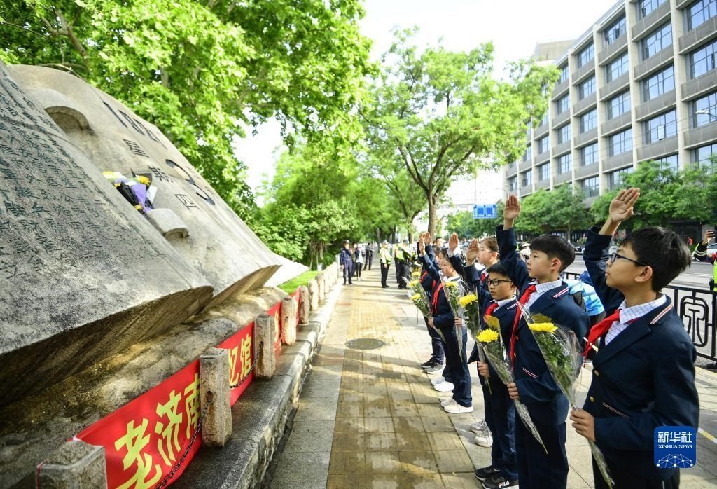 5月3日,小學生在“五三慘案”紀念碑前獻花。