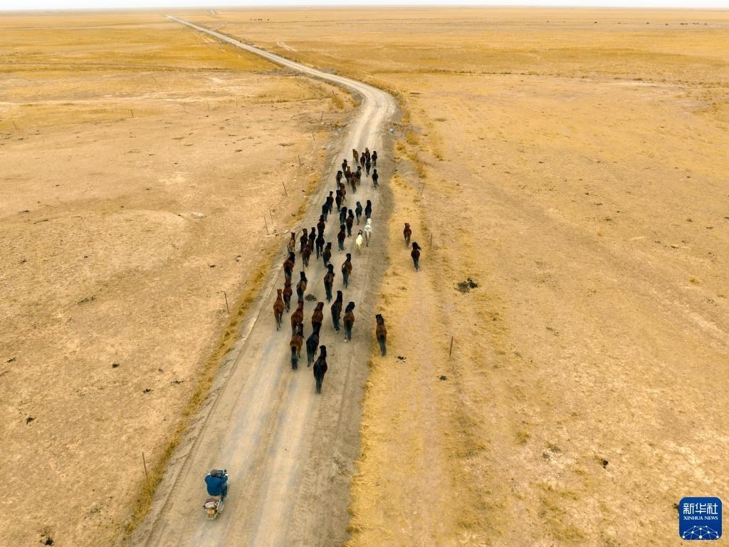 5月3日,在阿克塞縣阿伊納鄉(xiāng)海子草原,牧民趕著馬群進(jìn)行轉(zhuǎn)場(無人機(jī)照片)。