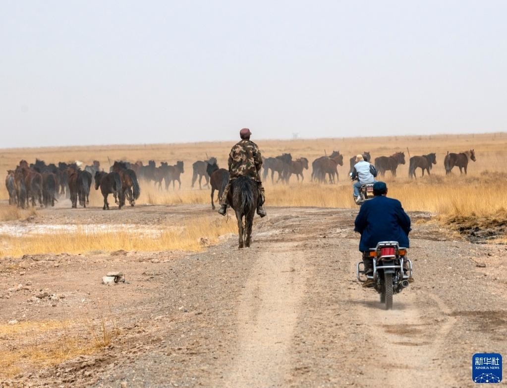 5月3日,在阿克塞縣阿伊納鄉(xiāng)海子草原,牧民趕著馬群進(jìn)行轉(zhuǎn)場。