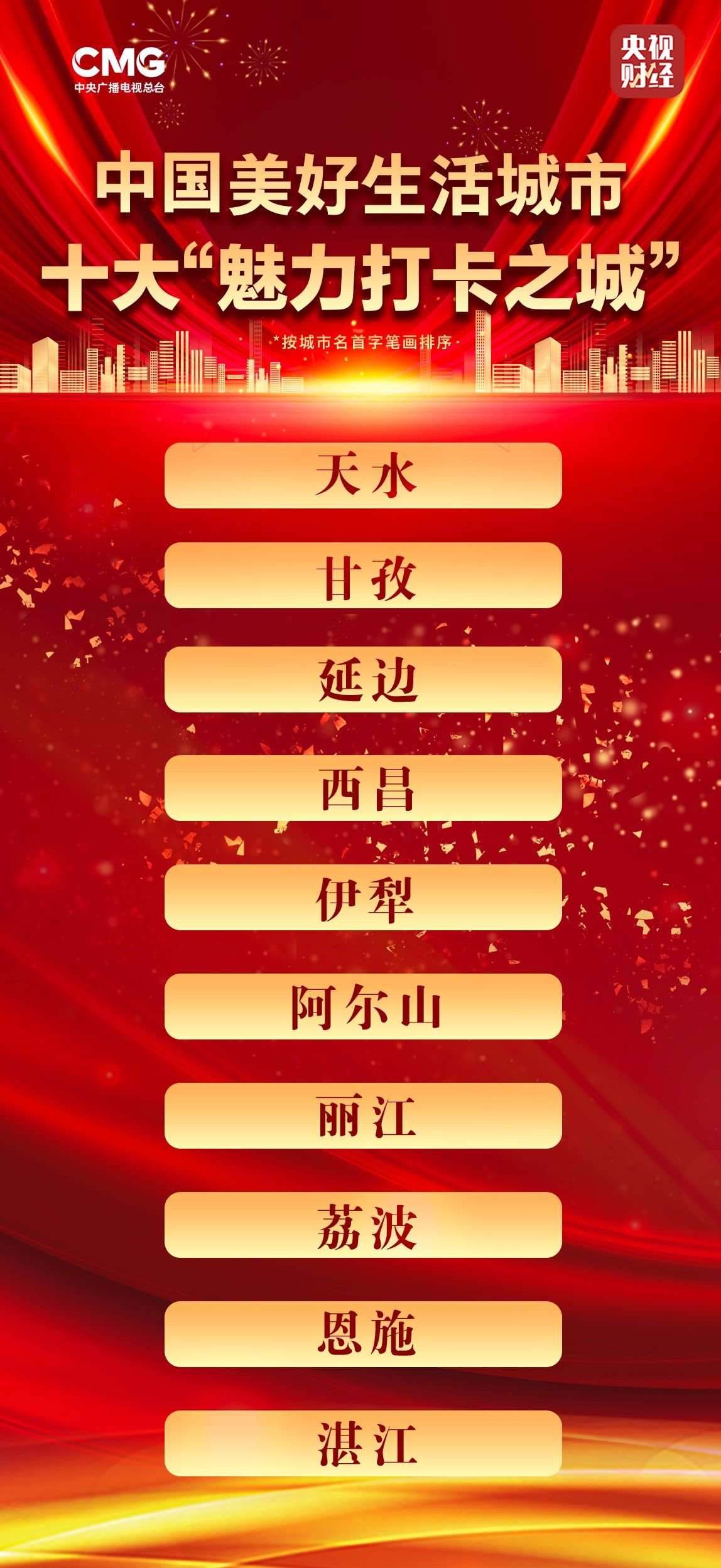 十大“魅力打卡之城”是天水、甘孜、延邊、西昌、伊犁、阿爾山、麗江、荔波、恩施、湛江(城市均以首字筆畫排序)。