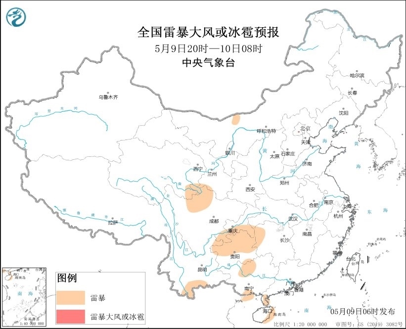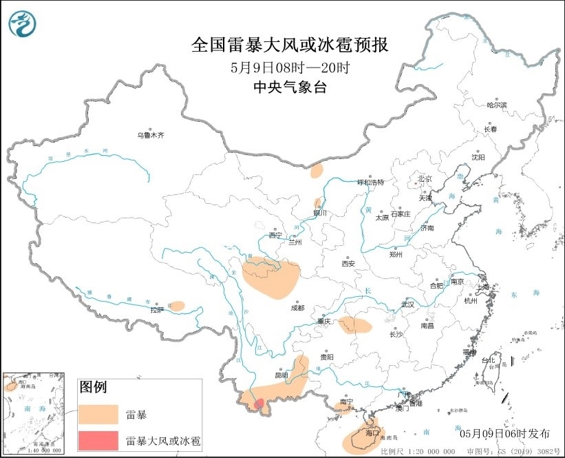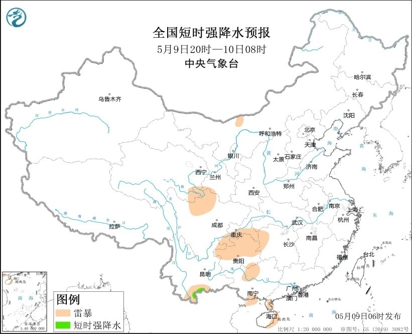 預(yù)計(jì)5月9日08時(shí)至10日08時(shí),云南西南部、海南島東北部和西南部等地的部分地區(qū)將有短時(shí)強(qiáng)降水天氣,小時(shí)雨量20-30毫米,局地可達(dá)50毫米以上;另外,云南西南部局地將有雷暴大風(fēng)或冰雹天氣。