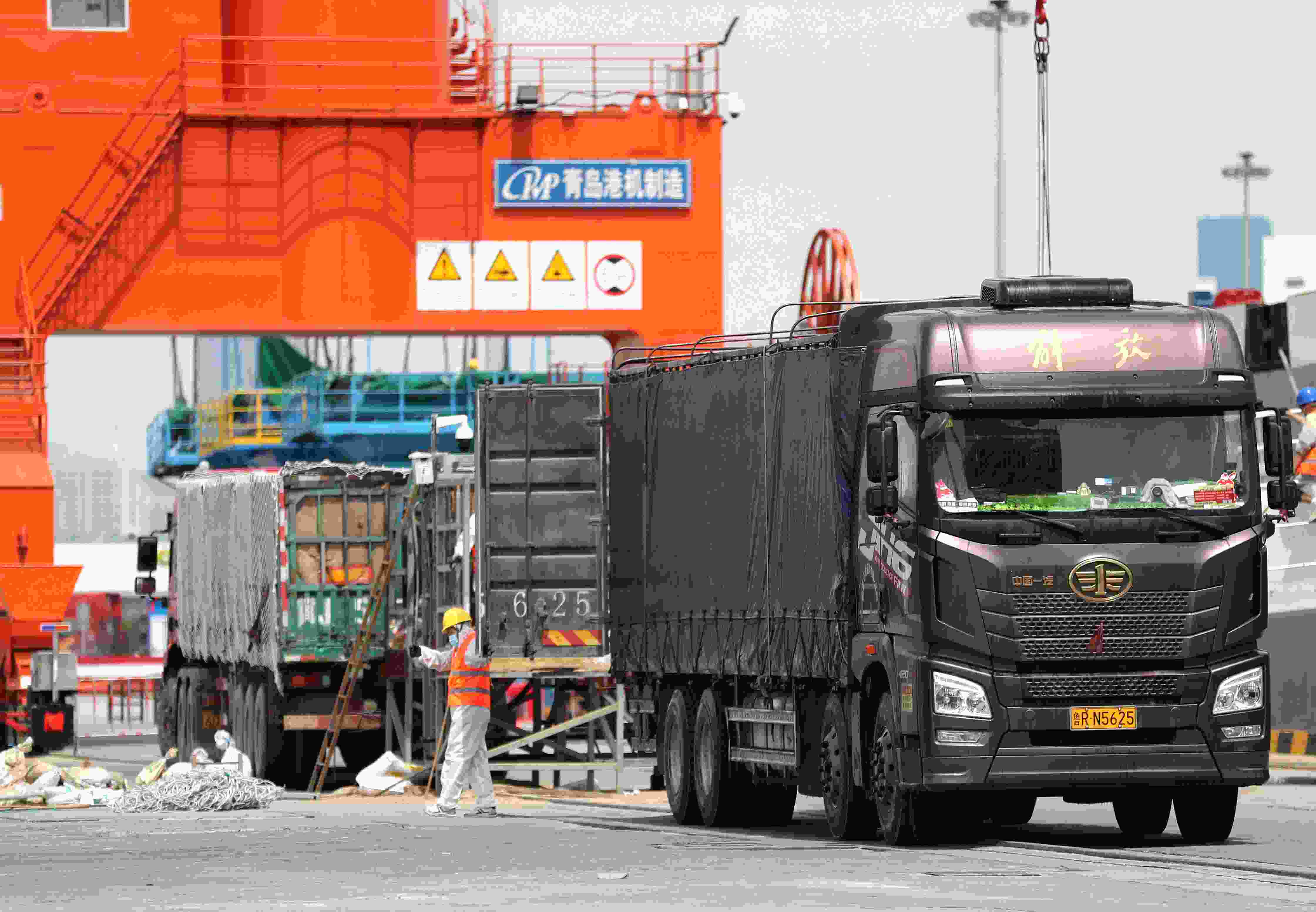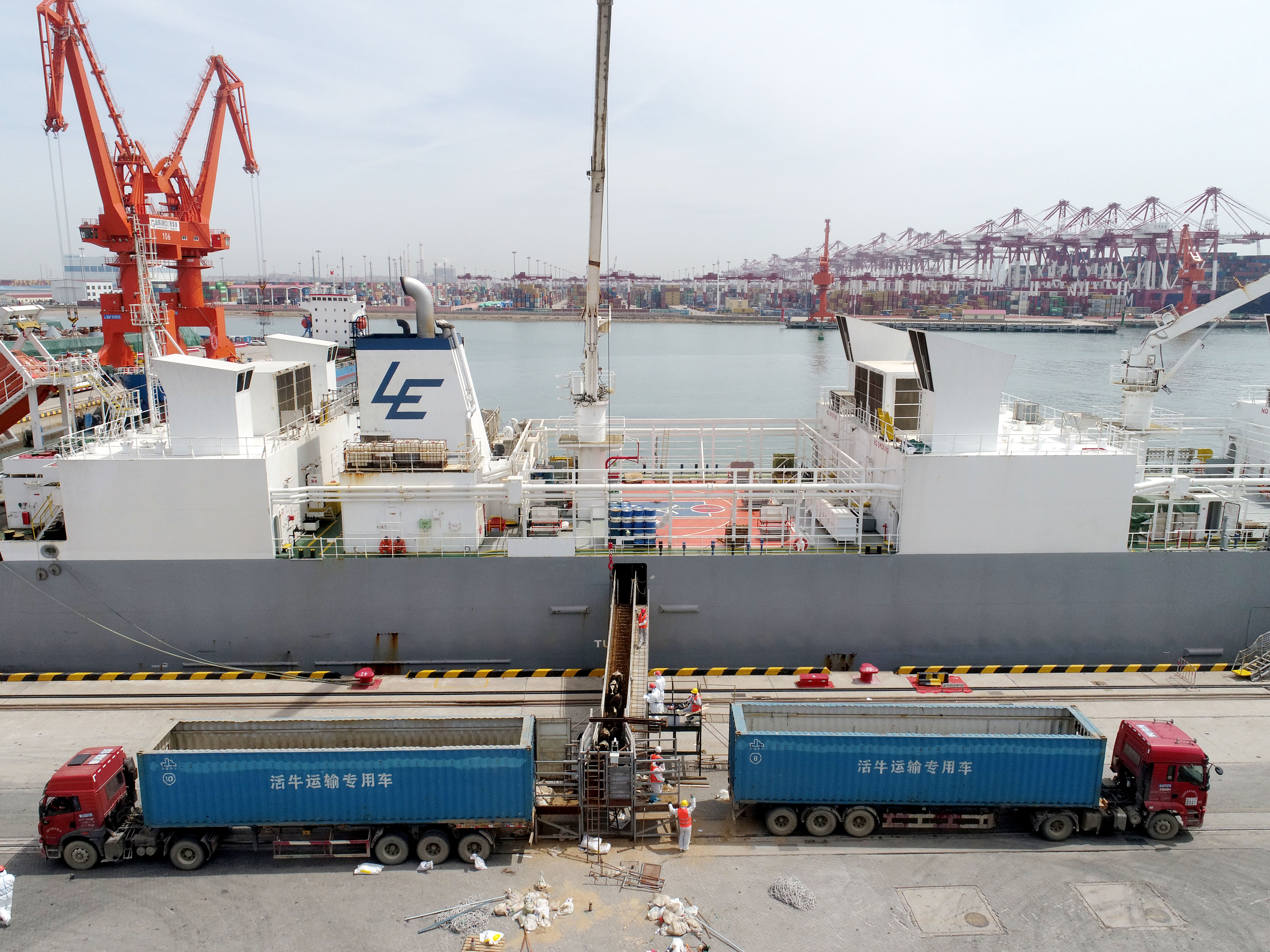 5月8日,在山東港口青島港前灣集裝箱碼頭,3000余頭活牛卸船轉運。