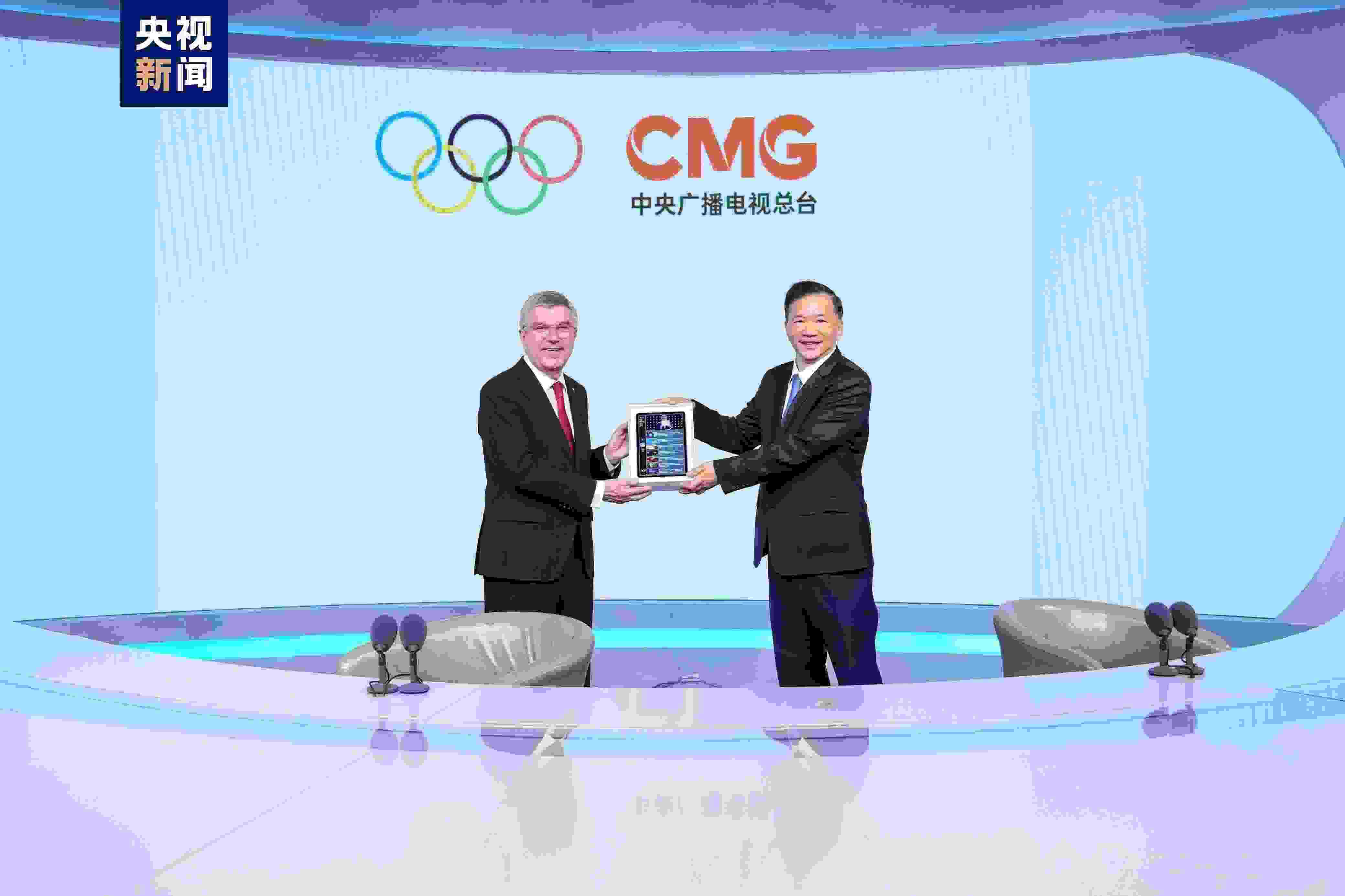 參觀結(jié)束后,慎海雄向巴赫贈送記錄雙方友好交往的視頻集錦和總臺系列精品節(jié)目,以及總臺成立五周年紀(jì)念郵品。在向慎海雄贈送親筆簽名的象征團(tuán)結(jié)與友誼的“奧林匹克之家”獎杯時,巴赫深情地說:“這是奧林匹克之家,也是您的家!”慎海雄說:“總臺也是奧林匹克人之家,我們共同為弘揚(yáng)奧林匹克精神繼續(xù)努力!”