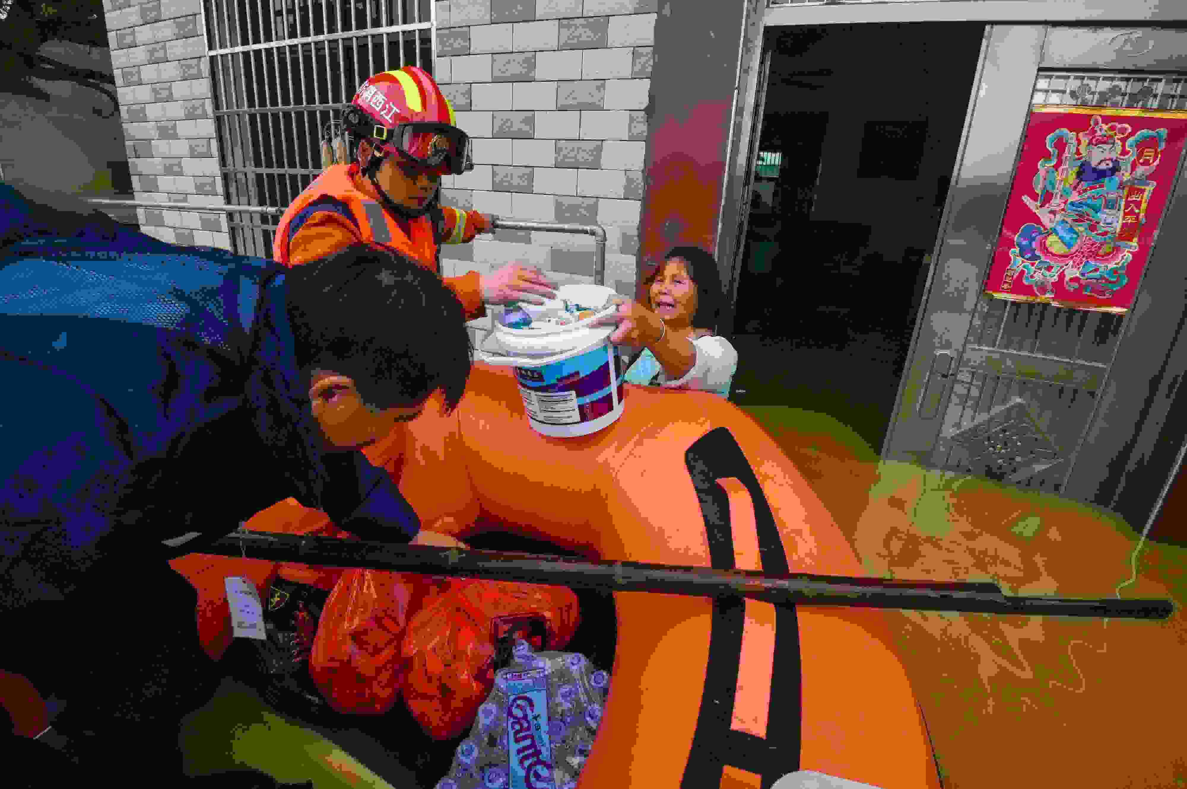2023年5月6日,江西吉安,新干縣消防救援大隊(duì)隊(duì)員在麥斜鎮(zhèn)拿埠村給受困群眾運(yùn)送生活物資。 視覺(jué)中國(guó)