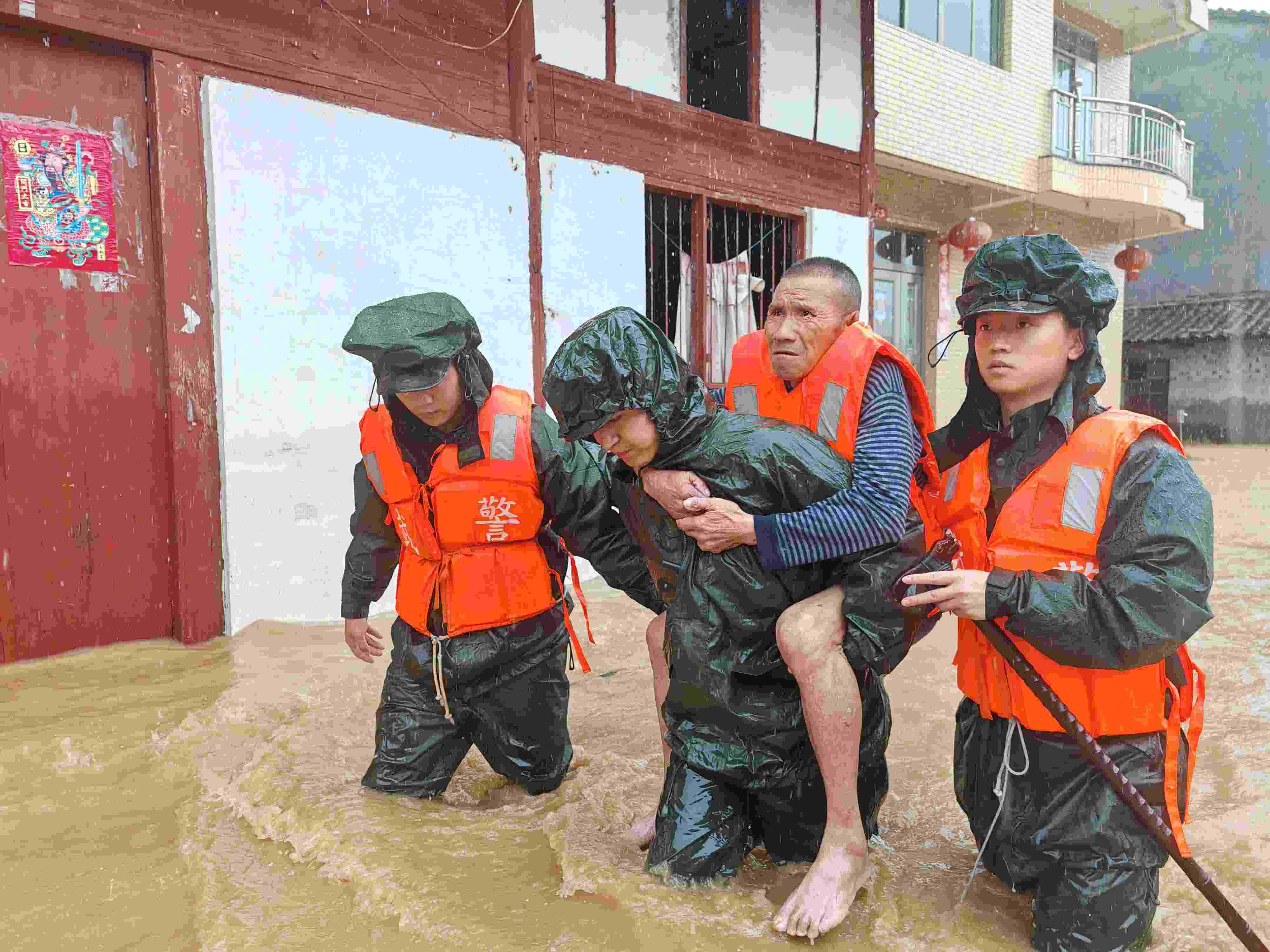 2023年5月6日,江西撫州,宜黃縣梨溪鎮(zhèn),武警撫州支隊(duì)官兵在轉(zhuǎn)移被困群眾。 視覺(jué)中國(guó)