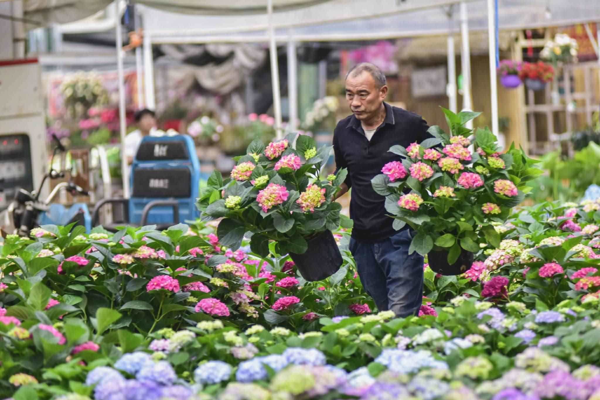 隨著母親節(jié)臨近,山東省青州市花卉苗木交易中心生意紅火起來(lái),色彩艷麗且寓意吉祥的康乃馨、繡球、長(zhǎng)壽花等受到消費(fèi)者青睞。視覺中國(guó)