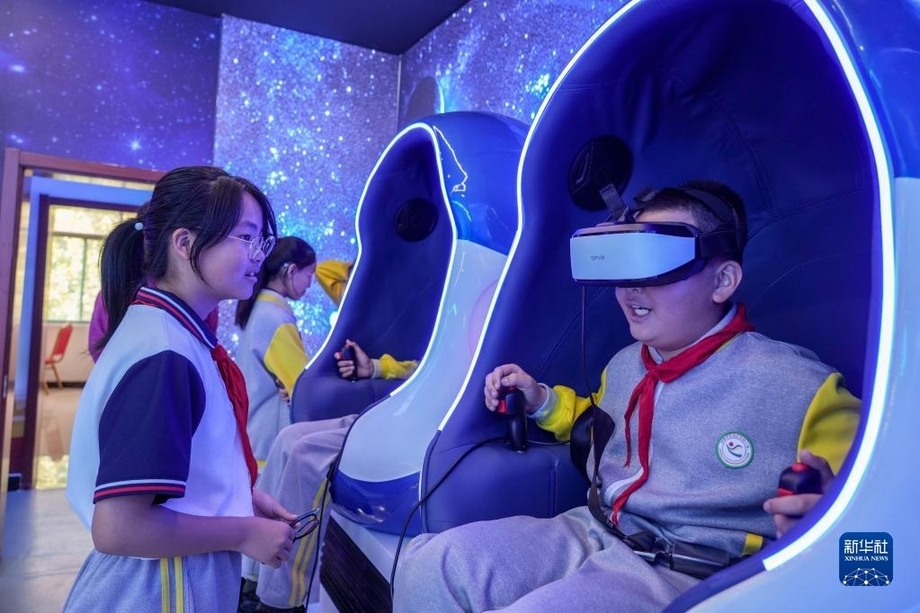 5月11日,小學(xué)生在馬店村科普體驗(yàn)中心內(nèi)體驗(yàn)VR科普展品。