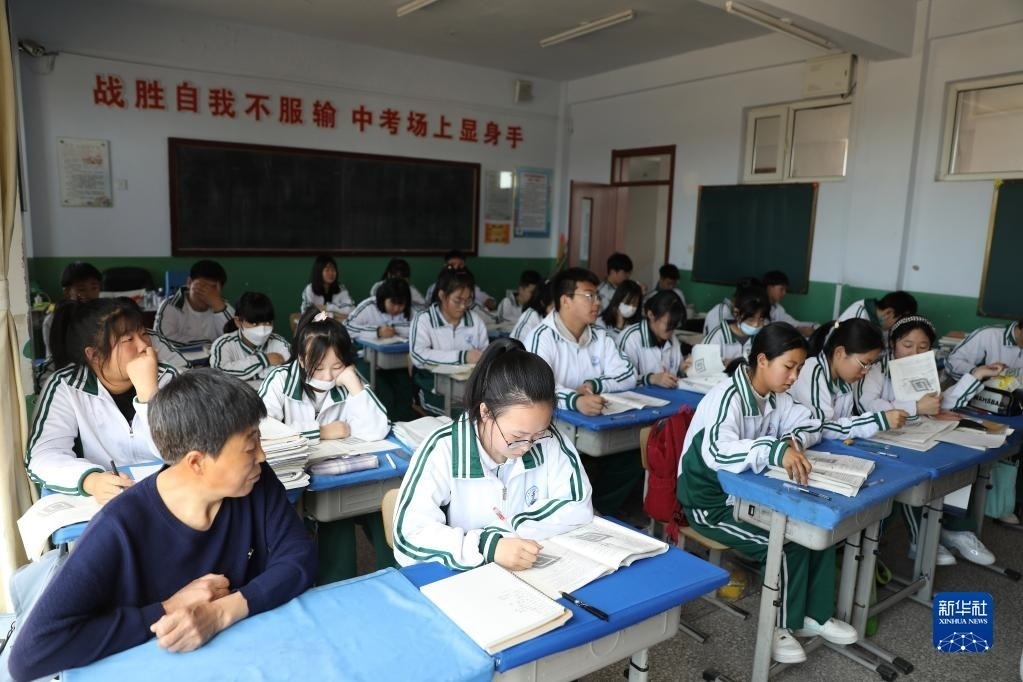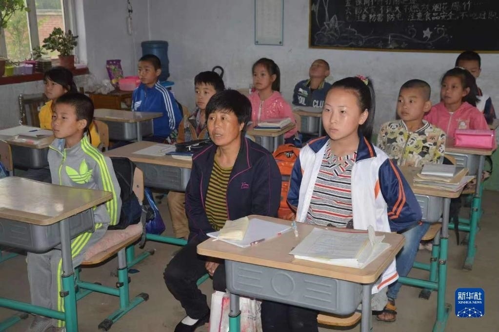 張連琴(左下)和女兒李昕偉在教室內(nèi)聽課(5月8日攝)。