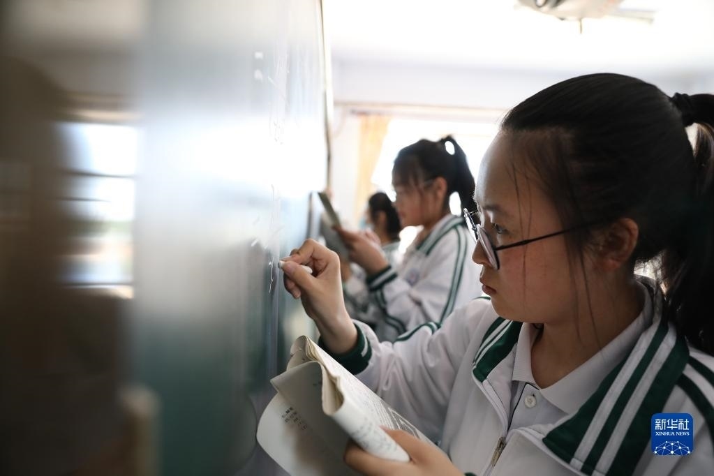 女兒李昕偉在教室黑板上答題(5月8日攝)。