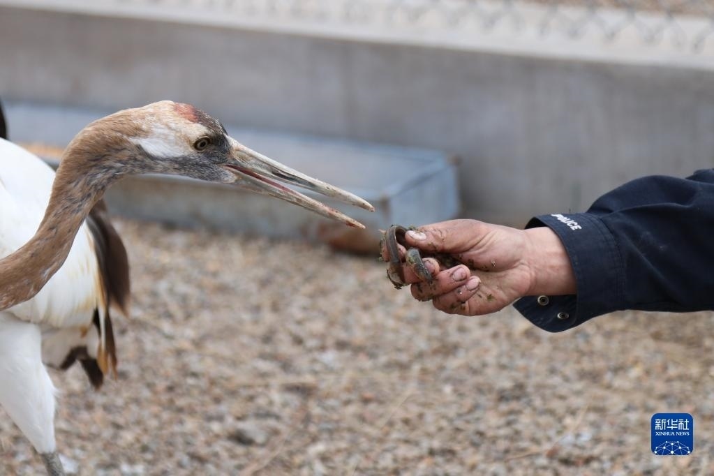5月11日,徐沃德樂胡在觀察救助的丹頂鶴進(jìn)食。