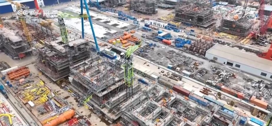 這些大家伙,都是世界技術(shù)比較領(lǐng)先的一些海工裝備。通過航拍的鏡頭,給大家展現(xiàn)一下,最遠(yuǎn)的是圓筒形超深水鉆探平臺。因為它的外形是獨(dú)特的圓筒型設(shè)計,所以它的抗風(fēng)浪性、作業(yè)水深的能力非常得好,技術(shù)指標(biāo)創(chuàng)下多項世界第一。這家企業(yè),一共向國外交付了6艘同類型的產(chǎn)品。