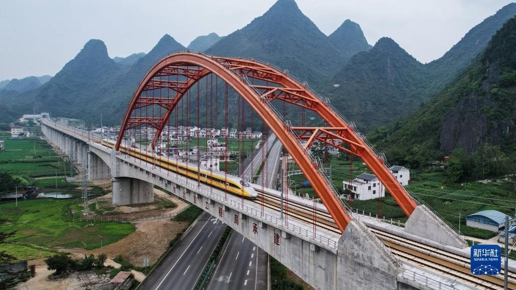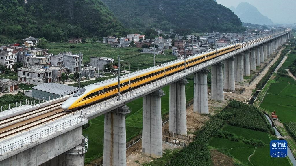 5月16日,高速綜合檢測列車行駛在貴南高鐵上進(jìn)行檢測工作(無人機(jī)照片)。