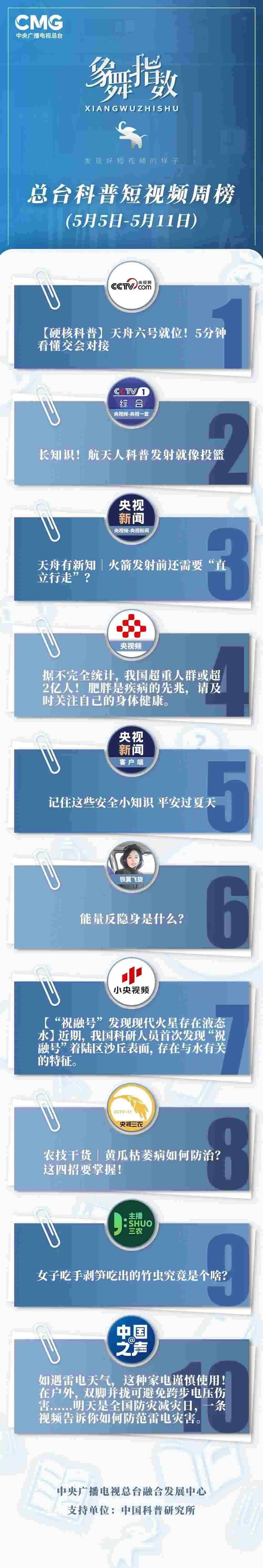 中央廣播電視總臺(tái)“象舞指數(shù)”評(píng)議品牌,推出科普短視頻周榜、總臺(tái)科普短視頻周榜。在2023年5月5日-5月11日,值得注目的內(nèi)容有: