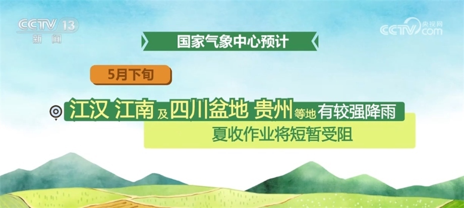 國家氣象中心預計,5月下旬,北方冬麥區(qū)大部分時段以晴好天氣為主,墑情適宜,利于冬小麥灌漿成熟;江漢、江南及四川盆地、貴州等地有較強降雨,夏收作業(yè)將短暫受阻;江淮大部天氣較好,適宜夏收。