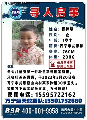 ·海南萬(wàn)寧一歲半女?huà)雭G失一夜未歸,丟失地點(diǎn)離家僅30米。