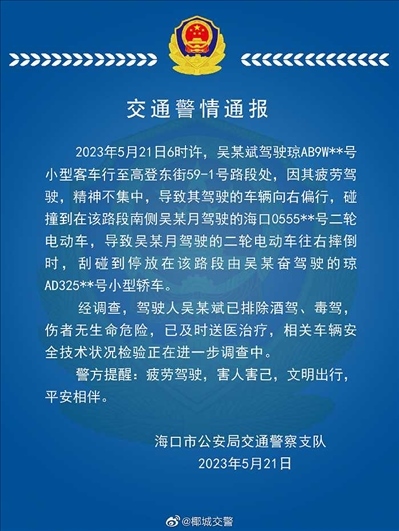 ·海口交警通報(bào)“一車(chē)輛沖上綠化帶撞倒環(huán)衛(wèi)工人”:司機(jī)疲勞駕駛,傷者無(wú)生命危險(xiǎn)。