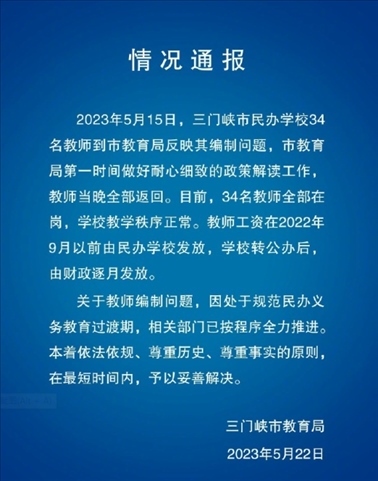 ·三門峽通報“34名教師反映編制4年未解決”:目前全部在崗,將妥善解決問題。