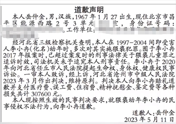 ·男子猥褻幼女因超追訴時效免于刑責(zé),民事訴訟敗訴后登報向受害人致歉。