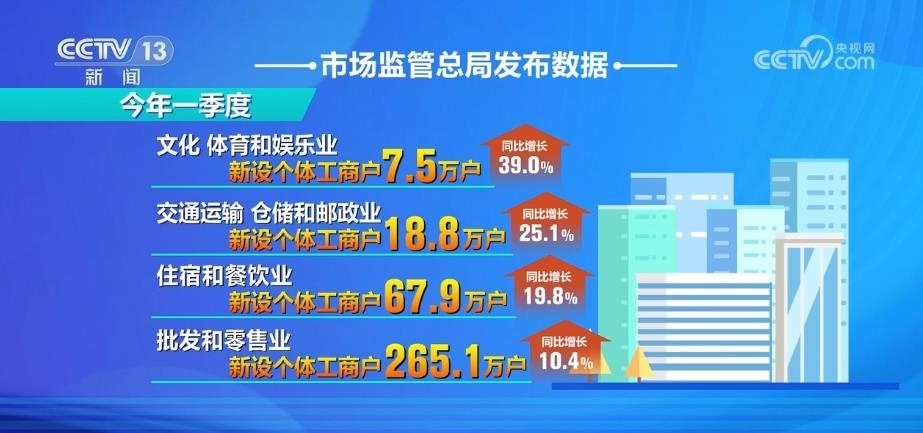 市場監(jiān)管總局發(fā)布數(shù)據(jù)顯示,今年一季度,文化、體育和娛樂業(yè),交通運輸、倉儲和郵政業(yè),住宿和餐飲業(yè),批發(fā)和零售業(yè)等行業(yè)新設(shè)個體工商戶分別為7.5萬戶、18.8萬戶、67.9萬戶、265.1萬戶,同比分別增長39.0%、25.1%、19.8%、10.4%。
