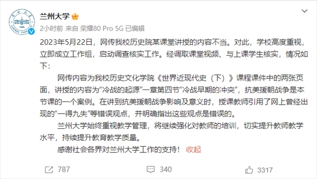 ·蘭州大學(xué)回應(yīng)教師課堂上“歪曲歷史”:教師引用網(wǎng)上曾經(jīng)出現(xiàn)的錯(cuò)誤觀點(diǎn),并指出這些觀點(diǎn)是錯(cuò)誤的。
