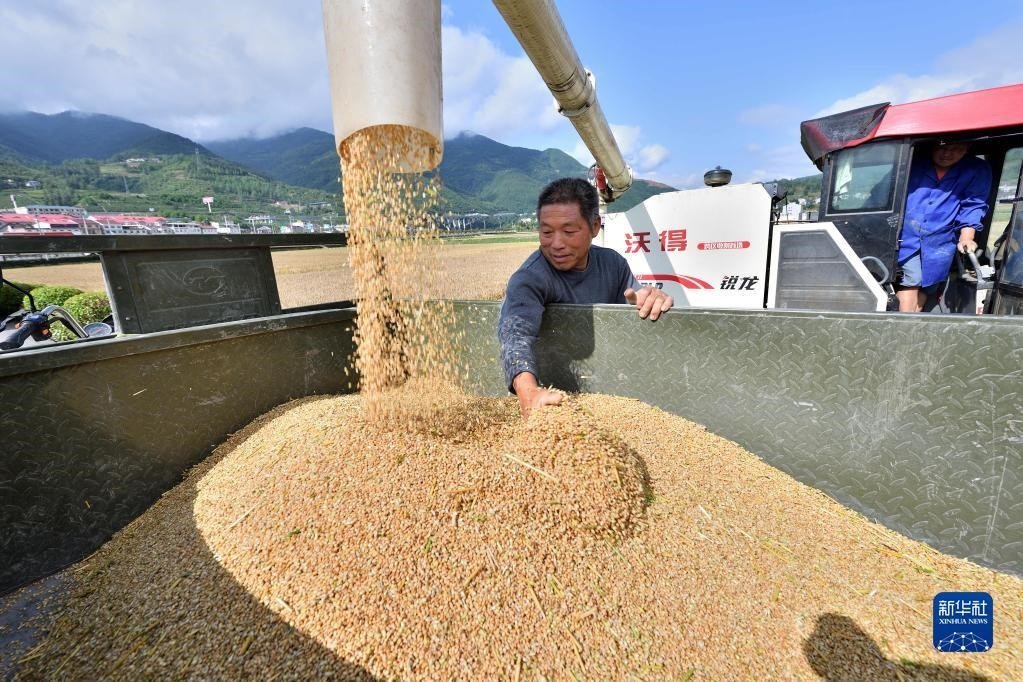 5月23日,河南省駐馬店市正陽(yáng)縣大林鎮(zhèn)漫塘村的村民駕駛農(nóng)機(jī)收獲小麥。