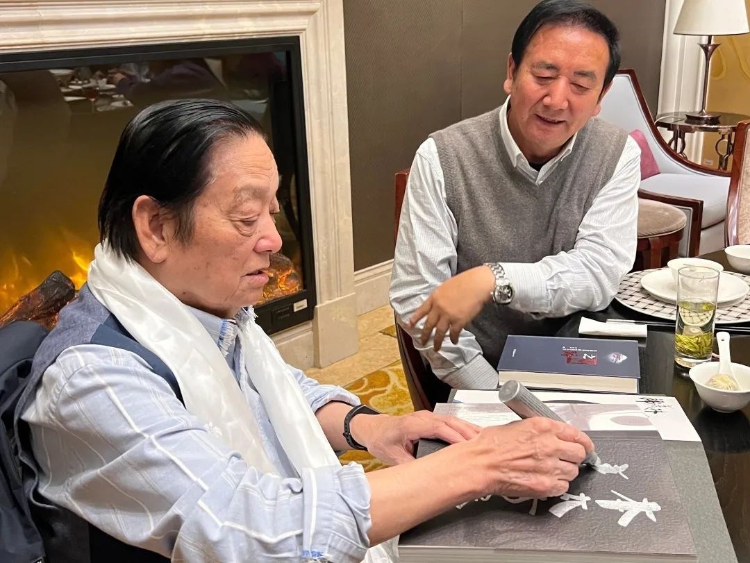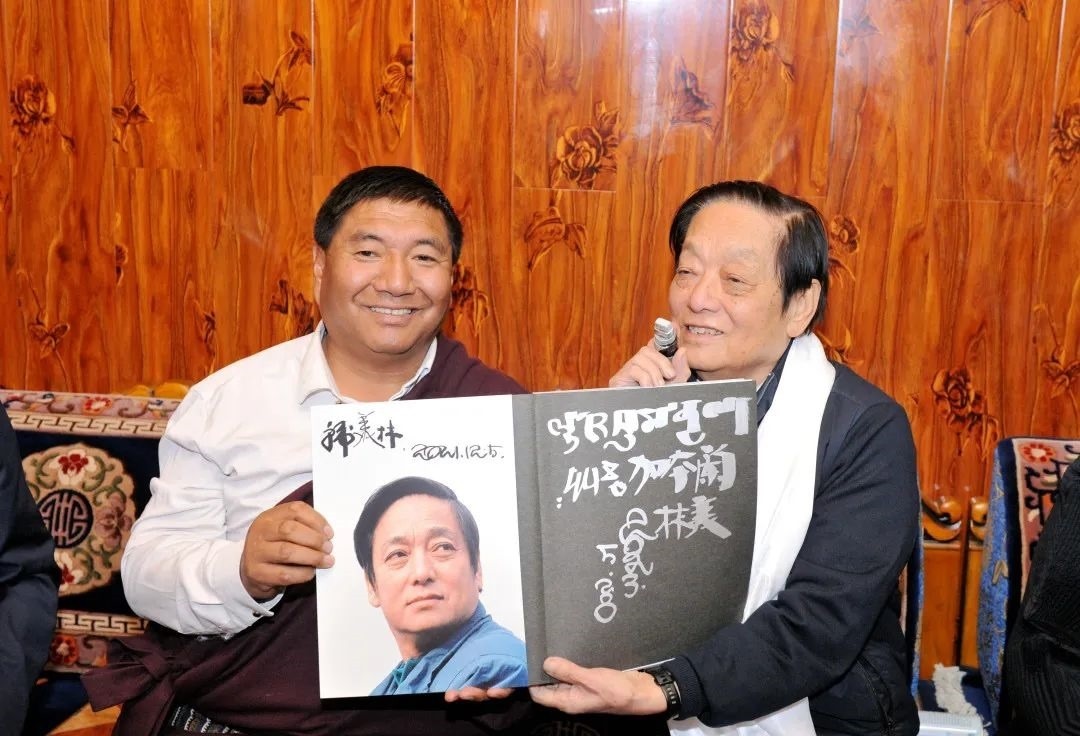 ▲韓美林為原青海省第十二屆人大常委會(huì)黨組副書記,現(xiàn)三江源生態(tài)保護(hù)基金會(huì)理事長(zhǎng)鄧本太簽書留念