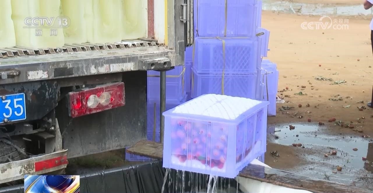 這邊采購商前腳剛走,梁康連就來到荔枝分揀打包中心?,F(xiàn)在這里剛采摘下來的荔枝,分選打包后,要放到冰水里浸泡一個小時以上,再裝上冷鏈車物流運(yùn)輸保證荔枝的新鮮度。