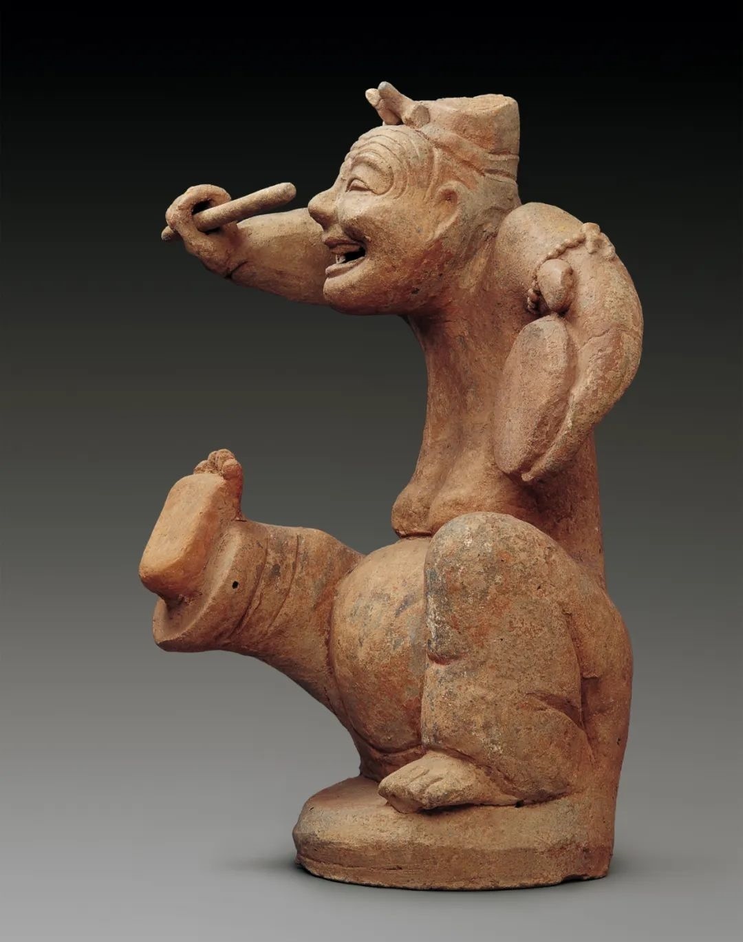 漢代俳優(yōu)大致以調(diào)謔、滑稽、諷刺的表演為主,并以此來(lái)博得主人和觀賞者的笑顏。他們往往隨侍主人左右,作即興表演,隨時(shí)供主人取樂。表演時(shí),他們一般邊擊鼓邊歌唱。當(dāng)時(shí)的皇室貴族、豪富大吏蓄養(yǎng)俳優(yōu)之風(fēng)甚盛。漢武帝“俳優(yōu)侏儒之笑,不乏于前”。丞相田蚡“愛倡優(yōu)巧匠之屬”?;笇挕尔}鐵論·散不足》云:“富者祈名岳、望山川。椎牛擊鼓,戲倡儛像?!边@些均可為證。漢代畫像石樂舞百戲圖中經(jīng)??梢钥匆娨恍┥聿拇侄獭⑸仙沓嗦愫蛣?dòng)作滑稽的表演者,漢墓中也不乏此類形象的陶俑出土,均顯示了俳優(yōu)表演在當(dāng)時(shí)的盛行。
