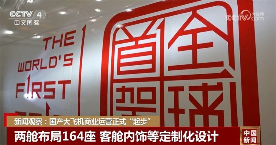 今天執(zhí)行商業(yè)首飛的C919飛機為164座兩艙布局,公務艙8座,經(jīng)濟艙156座。客艙內(nèi)飾、旅客座椅、機載娛樂系統(tǒng)和飛機外部涂裝做了定制化設計。機身前部印有“全球首架”的“中國印”標識和對應英文。飛機注冊號B-919A,“B”代表飛機的中國國籍,“919”和型號名稱契合,“A”則有首架之意,突顯這一全球新機型、全球首架的非凡意義。