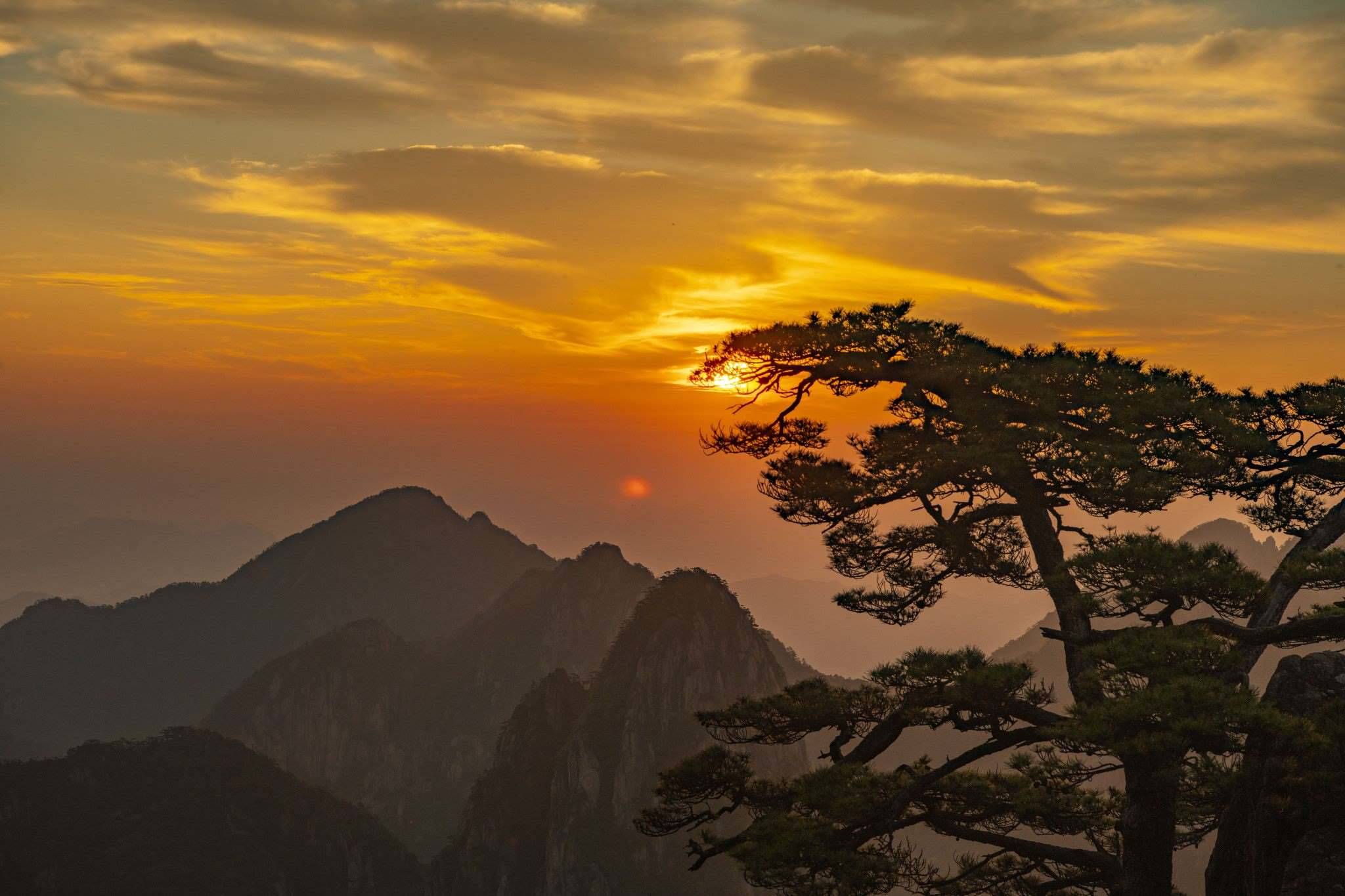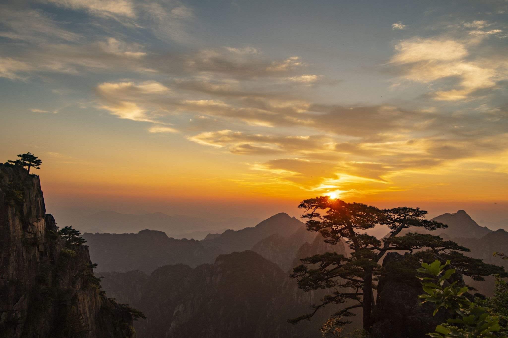 安徽黃山:霞光渲染下的奇峰秀色