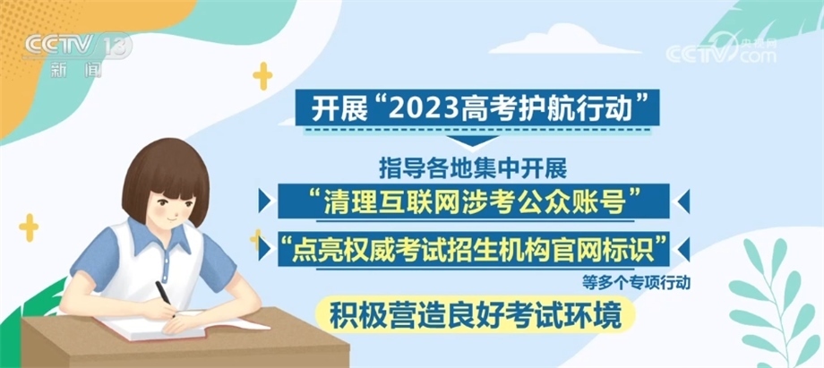 此外,將繼續(xù)開(kāi)展“2023高考護(hù)航行動(dòng)”,指導(dǎo)各地集中開(kāi)展“清理互聯(lián)網(wǎng)涉考公眾賬號(hào)”“點(diǎn)亮權(quán)威考試招生機(jī)構(gòu)官網(wǎng)標(biāo)識(shí)”等多個(gè)專項(xiàng)行動(dòng),積極營(yíng)造良好考試環(huán)境。