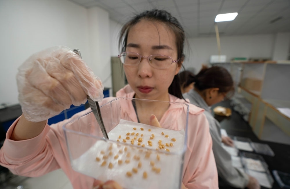 5月25日,在河北滄州渤海新區(qū)黃驊市中捷產業(yè)園區(qū)農科所種子檢驗室,技術人員在做小麥出芽率實驗。新華社記者 駱學峰 攝