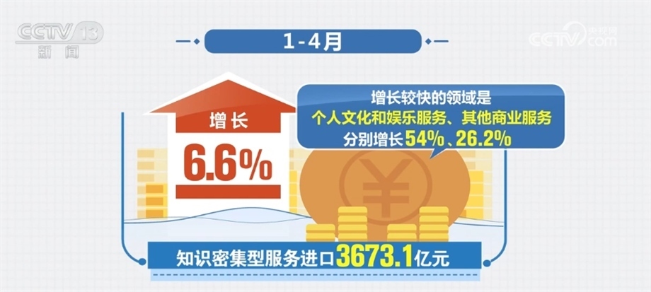 知識密集型服務貿(mào)易占比提升。1—4月,知識密集型服務進出口9057.9億元,同比增長13.1%,占服務進出口總額的比重達43.5%,較上年同期提升1.5個百分點。其中,知識密集型服務出口5384.8億元,增長18%;增長較快的領域是保險服務,增幅達260.5%。知識密集型服務進口3673.1億元,增長6.6%;增長較快的領域是個人文化和娛樂服務、其他商業(yè)服務,分別增長54%和26.2%。