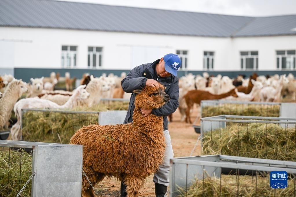 6月1日,巴彥杭蓋嘎查羊駝養(yǎng)殖基地的工作人員在觀察羊駝的飼養(yǎng)情況。