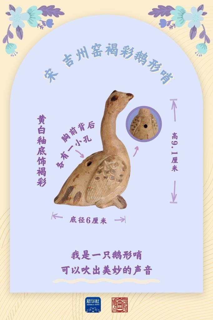 鵝形哨出土于江西吉安的宋代吉州窯遺址。吉安市博物館館長李希朗說,吉州窯的瓷土粗松,有近似于陶的特點(diǎn),可塑性較強(qiáng)。這里出土的瓷塑大多不超過10厘米,動物瓷塑的原型多為社會生活中所常見。從出土的瓷塑數(shù)量來看,吉州窯當(dāng)年的訂單量很大,頗受市場歡迎。也許每一只鵝形哨的背后,都有一名鼓著腮幫子的稚童。歷經(jīng)時光荏苒,鵝形哨到今天還能發(fā)出動聽的哨音。