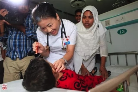 2013年,“和平方舟”號(hào)醫(yī)院船再次來(lái)到孟加拉國(guó)。上萬(wàn)民眾自發(fā)涌向中國(guó)醫(yī)院船,最高單日門診1700余人次。3歲的阿里法·沁健康么?中國(guó)軍醫(yī)牽掛著她。她家住在偏僻農(nóng)村,中國(guó)軍醫(yī)設(shè)法找到了她,邀請(qǐng)她登上“和平方舟”號(hào)醫(yī)院船體檢。