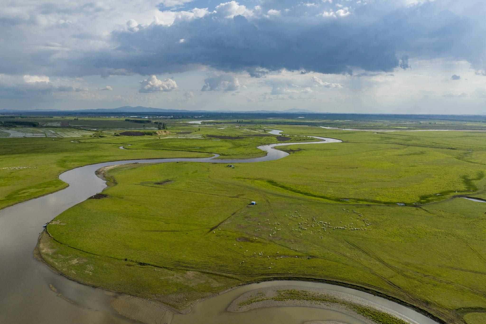2023年6月2日傍晚,黑龍江雞西,在密山境內(nèi)的穆棱河流域上空云景變幻,河套草原景色秀美。視覺(jué)中國(guó)