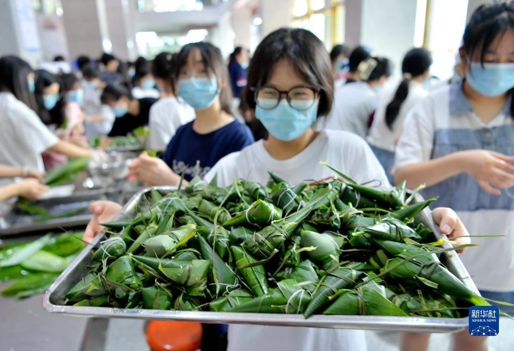 6月4日,湖北省宣恩縣一中的高三學(xué)生在展示包好的粽子。